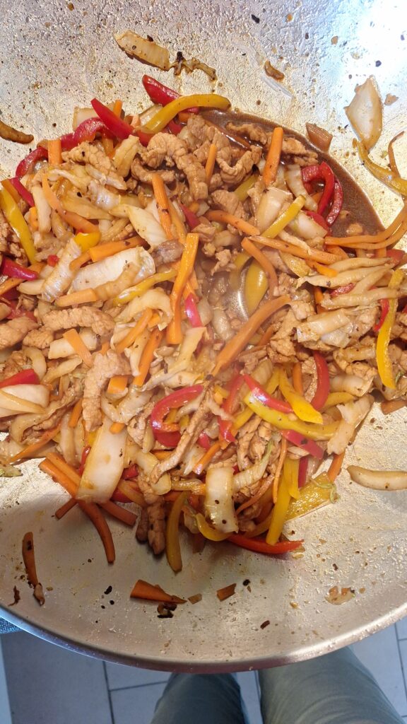 Fleisch mit ein wenig Öl im Wok anbraten. Danach entnehmen und zur Seite stellen.